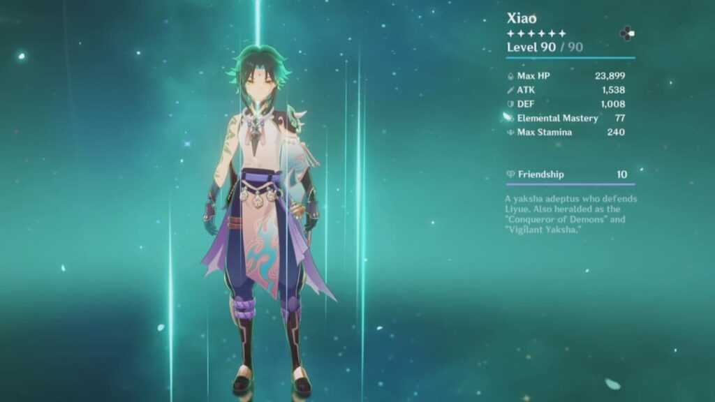 Последний из пяти якшей, посланных для уничтожения демонических сил Лиюэ, Сяо, возможно, является самым сильным персонажем Анемо в игре, наносящим наибольший урон. Он владеет древковым оружием, и его атаки имеют хороший радиус действия и скорость благодаря его любимому оружию. Его стихийная атака, Лемнискатический цикл ветра, заставляет его бросаться к врагам, нанося им тяжелый урон и оглушая их. Когда активируется Elemental Burst Сяо, он надевает маску Якши и получает повышенную способность к прыжкам, увеличенную область действия и урон от атаки, а также преобразует весь урон от атаки в урон от анемо. Сяо не лучший, когда дело доходит до командной полезности. Тем не менее, его приличный урон оправдывает огромную цену, необходимую для повышения его уровня до 90.