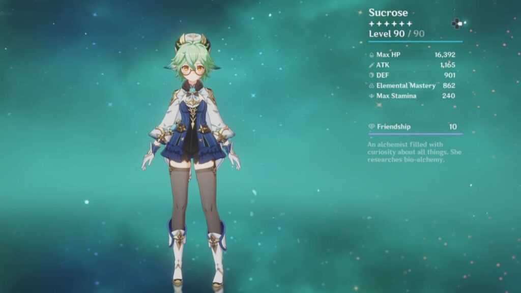 Как 4-звездочный персонаж, Сахароза не может быть чьим-то немедленным выбором. Однако именно по этой причине прокачка Сахарозы до уровня 90 вполне разумна с точки зрения потраченной смолы. Наряду с этим, ее потенциал урона за пределами поля и командные баффы делают ее очень эффективным персонажем в командных композициях, в которых есть несколько элементов. Сахароза увеличивает урон от реакции на стихии, усиливая мастерство стихий всей команды, которое масштабируется вместе с ее собственным. У нее также хороший контроль толпы, и она может собирать врагов и ослаблять их, что делает ее хорошим выбором практически для любого компа.