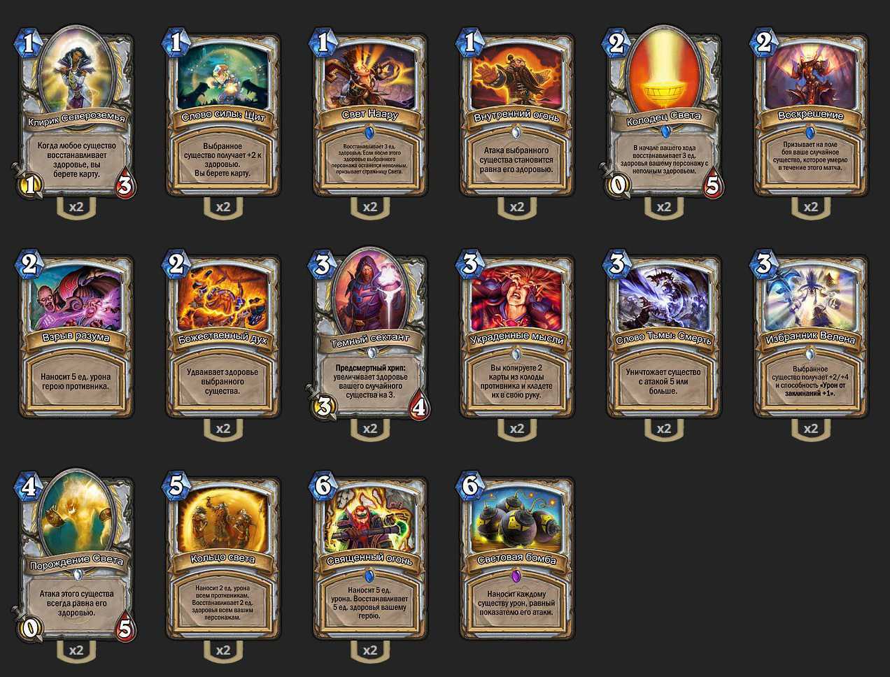 В стартовую руку ищем Клирика Североземья, Колодец света, Слово силы щит, Темного сектаната. Основная задача раскачать колодец света и/или Порождение света такими картами как божественный дух, избранник Велена, слово силы щит. Так же если Ваш колодец вдруг погиб, то вы сможете восстановить его воскрешением.