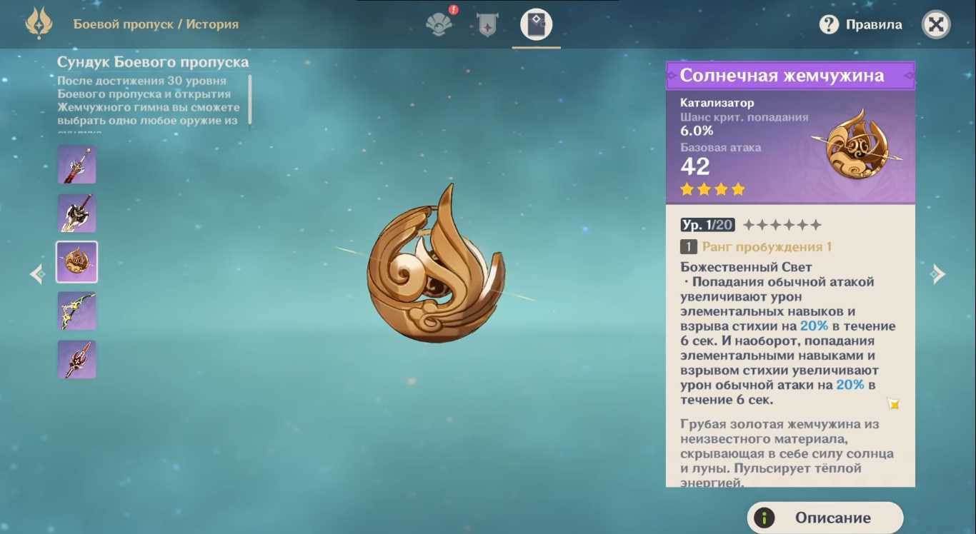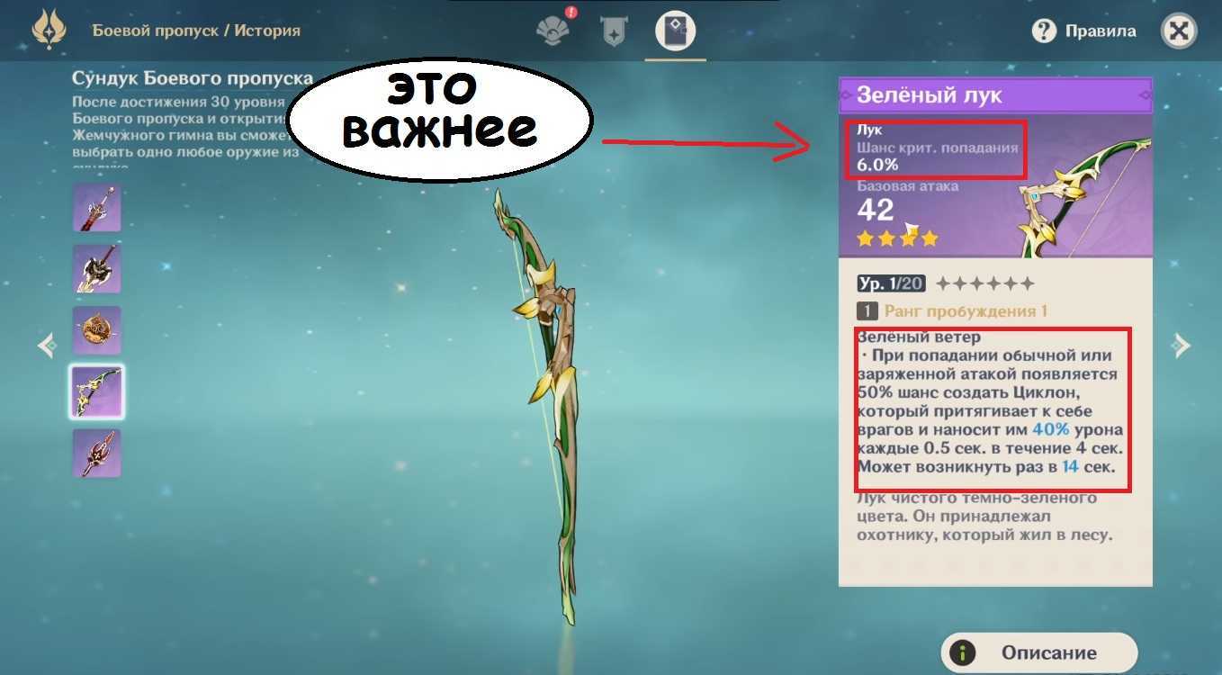 А еще на 30 уровне ленты боевого пропуска вы получите оружие на 4 звезды. Главная фишка оружия, которое вы здесь получите, не в абилках, а в шансе на крит. В Genshin Impact криты – это имба, оружие с критами нереально вытаскивает игру. Подробное описание оружия, которое вы можете получить в ленте, вы найдете на скриншотах ниже.