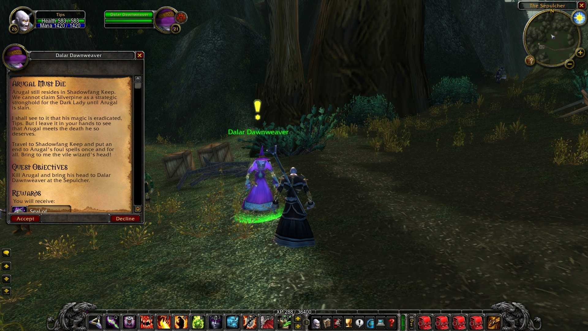 Фракция: Орда Требуемый уровень: 18 Награды: Печать Сильваны Смерть Аругалу! это один квест, полученный от Далара Ткача Рассвета в Серебряном бору.