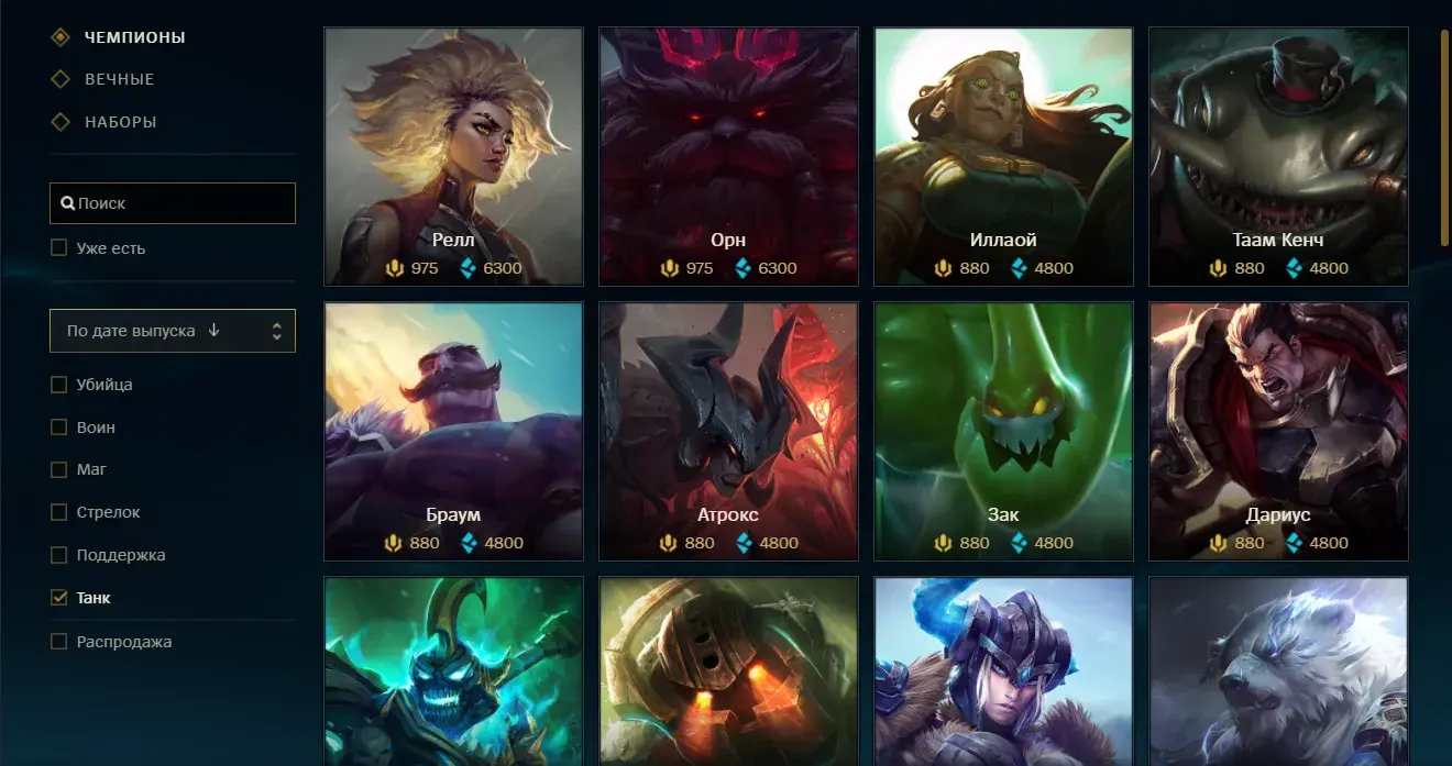| C | Поппи, Райз, Пантеон, Триндамир, Йорик, Мальфит, Кейл, Гвен, Ренектон, Енэ, Доктор Мундо, Рек’Сай, Каин. |