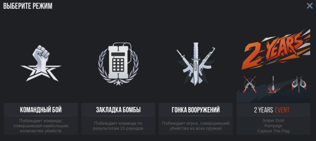 Далее потребуется выбрать режим, в котором мы хотим участвовать. Режимы присутствующие на сервере на данный момент: