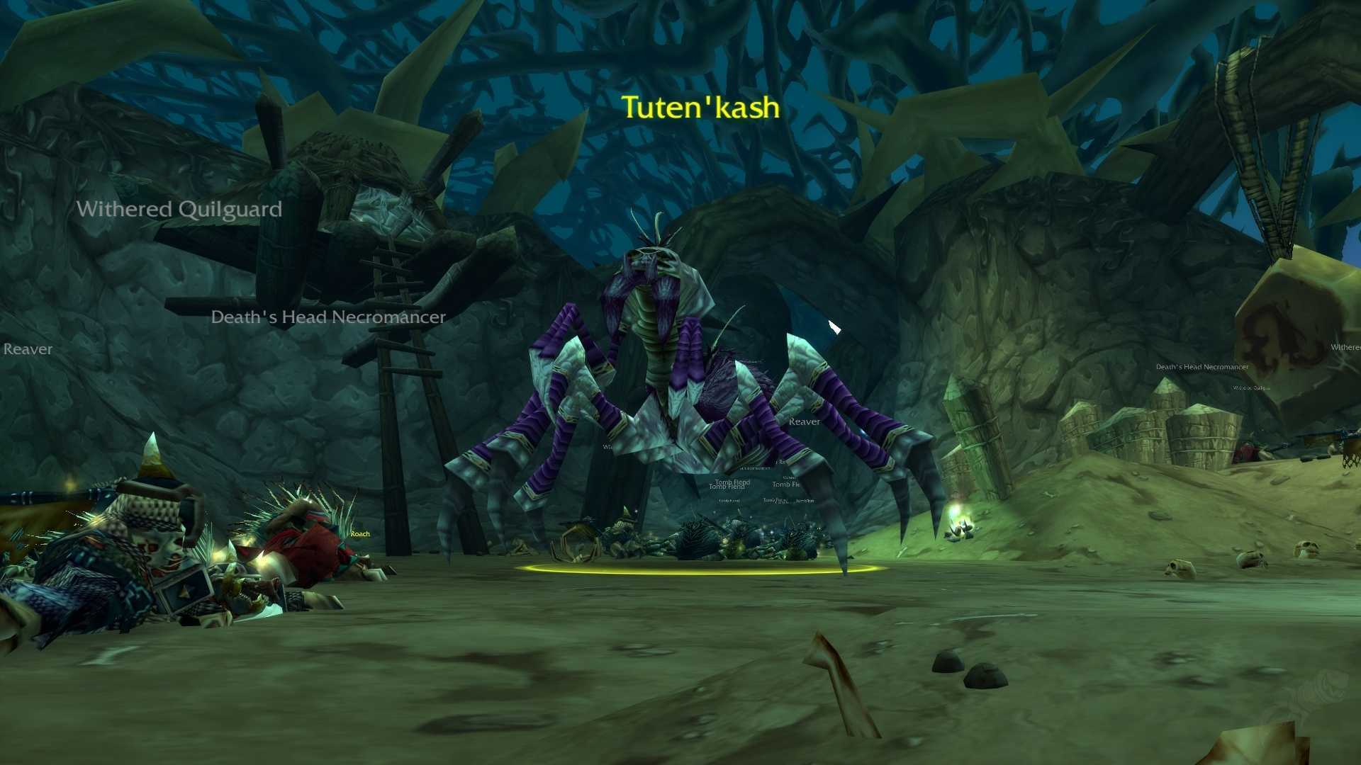 Tuten’Kash вызван через удар по гонгу паука. Прежде чем вступить с ним в бой, вам нужно сначала очистить несколько волн от пауков. После того, как каждая волна закончена, ударьте в гонг снова, чтобы вызвать следующую волну. Волны просты и понятны, как и Тутен’каш. Танк должен стоять лицом от него, чтобы избежать ненужного разбрызгивания, но другие его способности ничтожны.