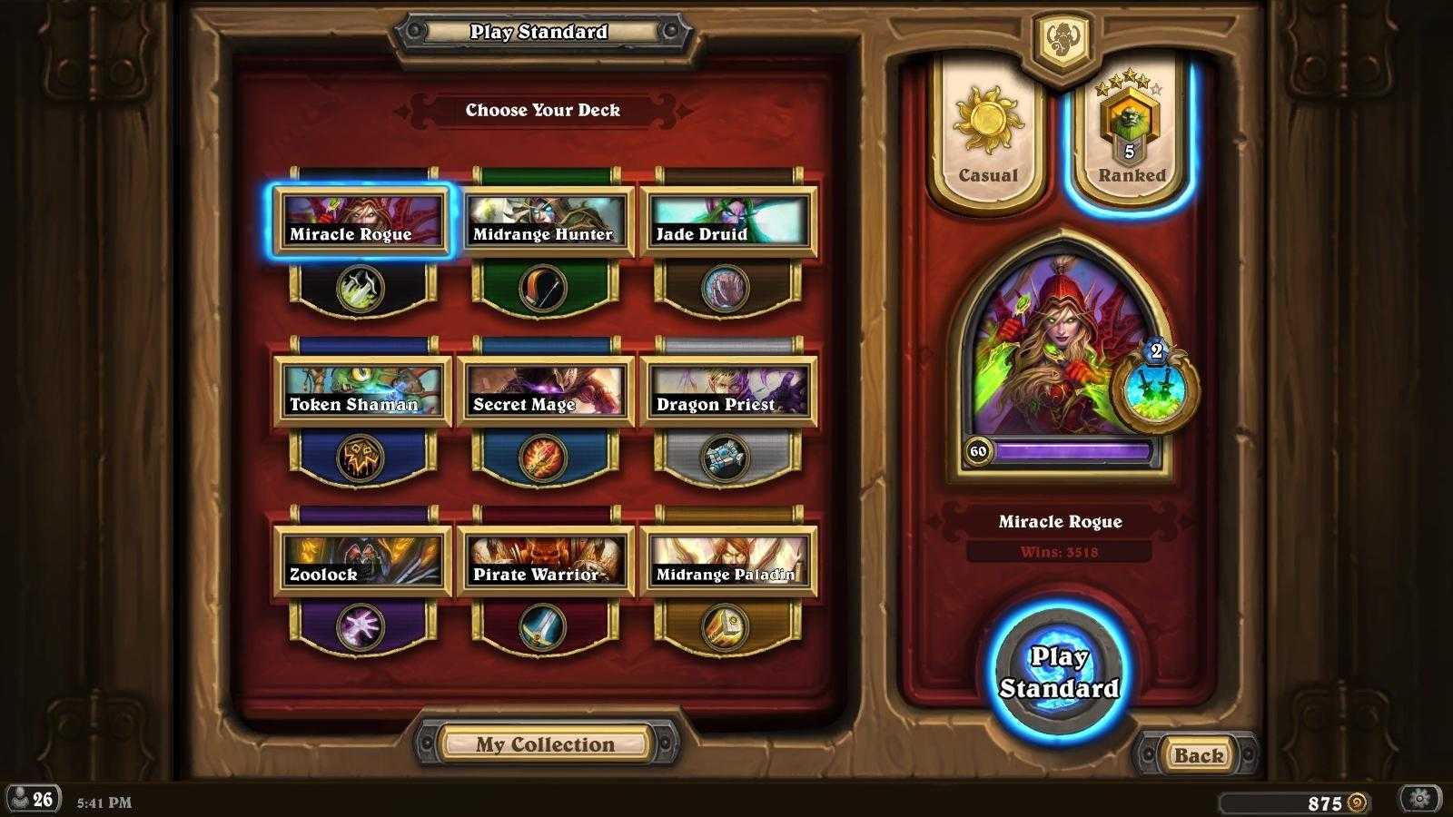 Игра. Здесь воспроизводится режим обычной игры (в режиме «Случайный» или «Рейтинговый»). Если вы новичок в Hearthstone, мы искренне рекомендуем вам сначала погрузиться в повседневную игру, чтобы понять её. По мере продвижения ваших знаний об игре и вашей коллекции Рейтинг предложит новую задачу, позволяющую вам подняться в рейтинге и соревноваться с другими игроками вашего уровня мастерства! В конце месяца рейтинг будет сброшен вместе с вашим рангом, и вы получите награду, соответствующую тому, насколько хорошо вы играли во время рангового сезона!