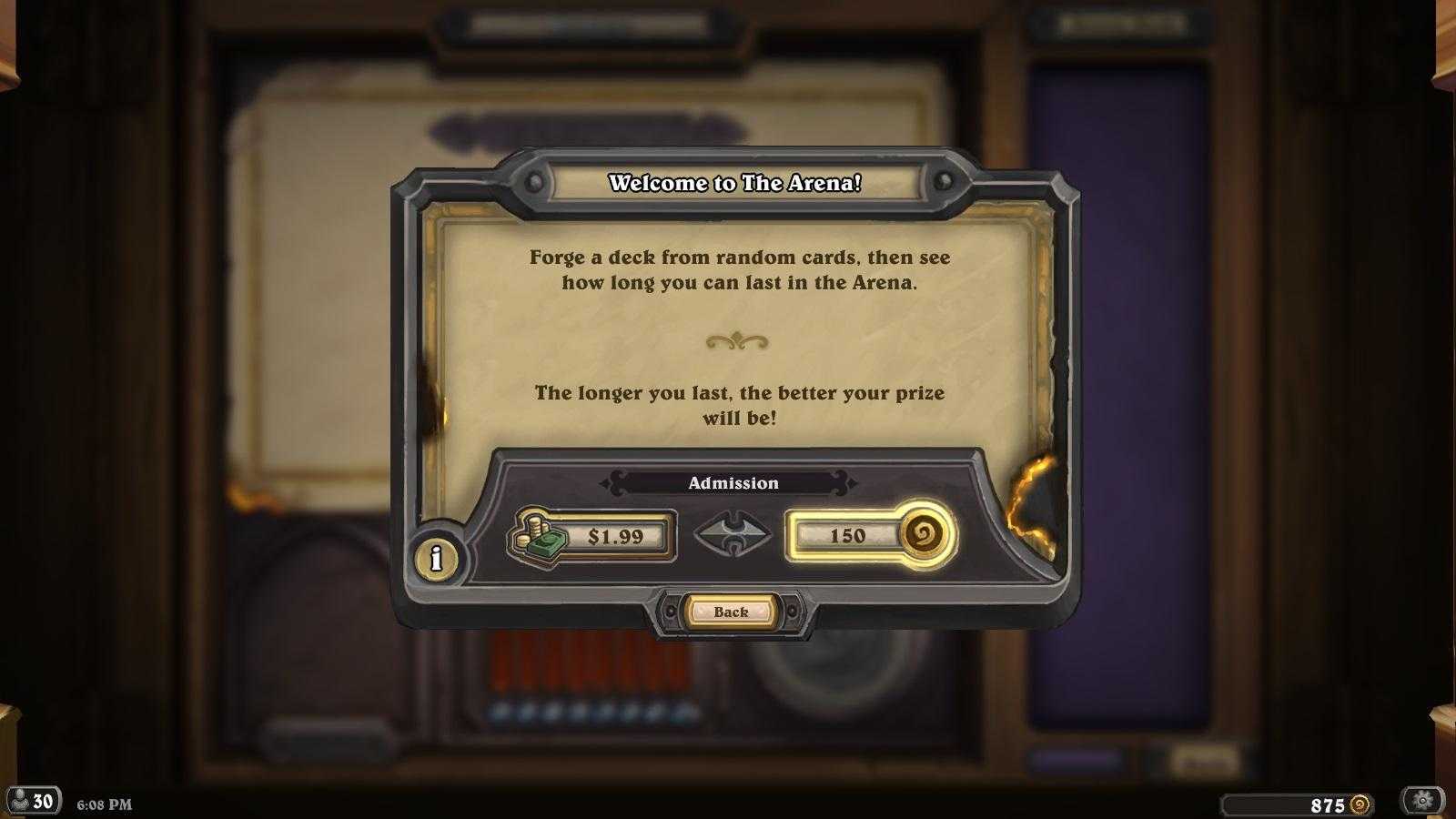 Игра на арене стоит 150 золотых (или 1,99 доллара / 66 рублей). Независимо от результата, вы получите повышение карты с каждой Арены. Золото, заработанное игрой на Арене, лучше вкладывать, а не покупать апгрейды. Если вам удастся одержать 5 или более побед на Арене, вы получите бустер «бесплатно», плюс вы получите больше золота. Кроме того, игра на Арене улучшит ваше понимание основ игры, механики различных классов и расширит ваши знания о большинстве карт. Став лучшим игроком на Арене, вы можете получить больше от этого игрового режима, что в конечном итоге означает «неисчерпаемый» золотой запас.