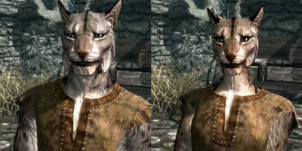 Раса использует тело UNP, поэтому одежда для других тел на ней будет смотреться не очень. На голове нет человеческих ушей, поэтому некоторые причёски из-за пустого места там, где были уши, тоже смотрятся не очень. Добавлены текстуры и инструкция по смене тела на СВВЕ, смотрите в папке “опционально”.