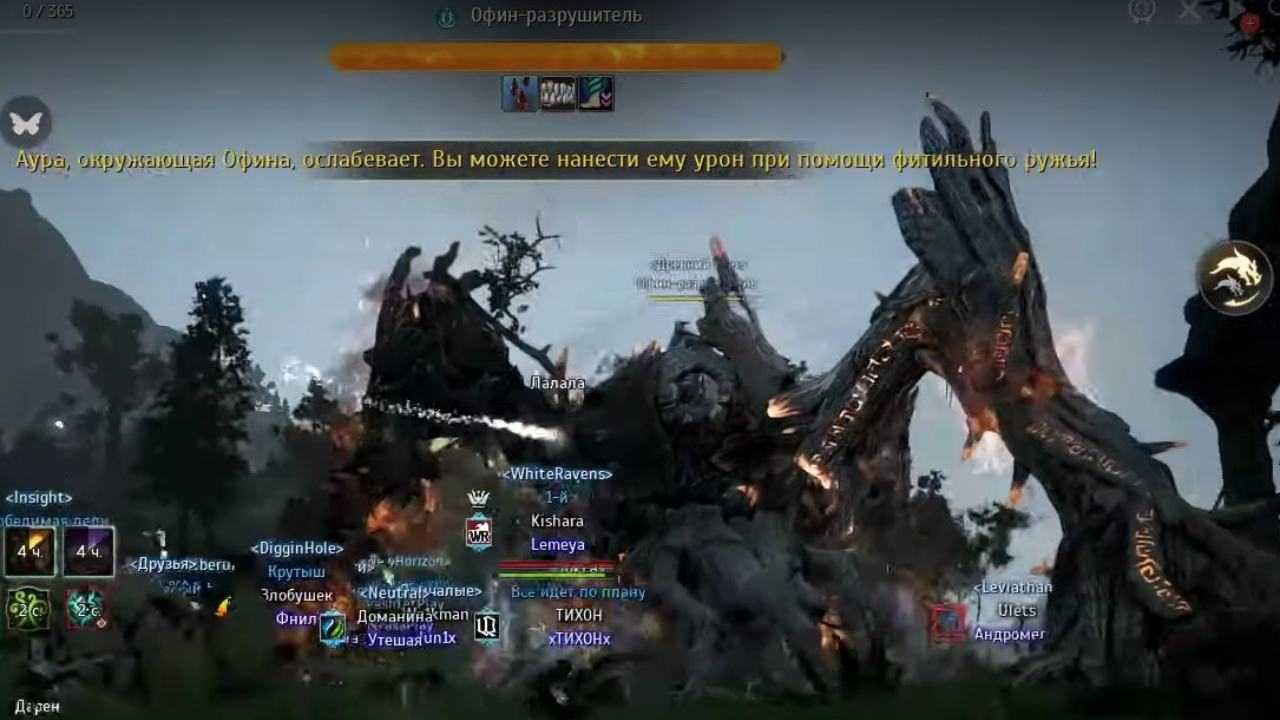 Но после его появления необходимо как можно больше нанести урона по монстру со шкалой здоровья. Босс лишается щита на время, пока не нанесет определенное количество урона, потом снова прячется в деревянного монстра. Его выходу способствует уничтожение каждого из трех корней. После поражения последнего Офин-тет появляется без клонов и его можно добить.