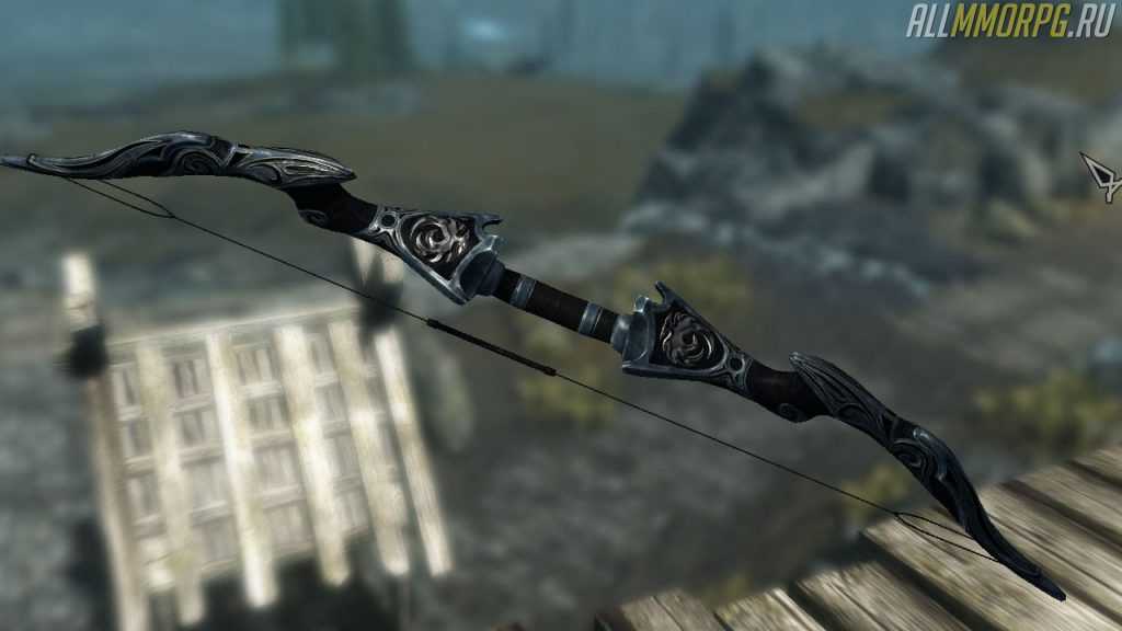 Даэдрический лук – хорошая замена Эбонитовому луку. Он не только привлекательно выглядит за счет «демонической» раскраски, но и наносит высокий урон. Получить оружие удастся во время обыска сундуков на 47 уровне и выше. С небольшим шансом главный герой найдет лук с зачарованием.