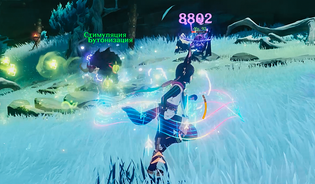 Одна и та же Дендро-аура Тигнари дала Митачурлу Бутонизацию от атаки Барбары и Стимуляцию от ворона Фишль на сдачу