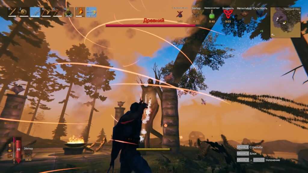 По углам алтаря Древнего расположено четыре высоких колонны, за которыми можно укрыться от атаки лозами. Это неразрушаемые объекты игрового мира. В отличие от окружающих деревьев, босс их не повалит. Древний крайне чувствителен к урону огнем. Оптимальный вариант — горящие стрелы, а на ближней дистанции факел или топор.